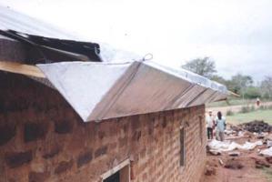 They prevent rainwater from over-shooting gutters. They are made of strips of iron sheets bent at an angle and nailed onto the roof. Gutters are suspended with from the splash-guard using galvanized wires.