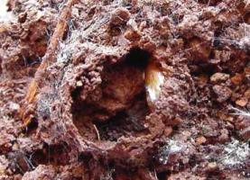 The pupae are brown in colour right after pupation turning darker brown and finally almost black. They are 10 to 14 mm long, with a smooth, shiny surface, and are enclosed in a delicate cocoon of soil particles held together by silk.