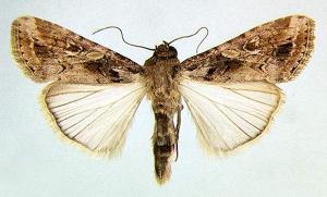| Armyworm, adult male moth S. exempta (museum set specimen). 1.4 to 1.8 cm long and with a wingspan of about 3 cm. |