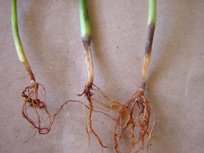 Damage to French bean plants by larvae of the stripped bean weevil. Note larva inside stem. Inset- close-up of larva.