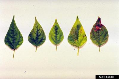 Rust on lower leaf surface of French beans. Symptoms are similar on green grams.