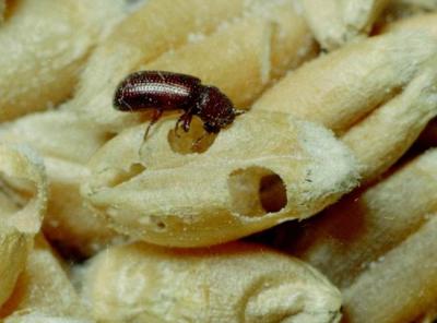 Lesser grain borer (Rhyzopertha dominica). Adults are 2-3 mm in length and reddish-brown in colour (shown on wheat grains).